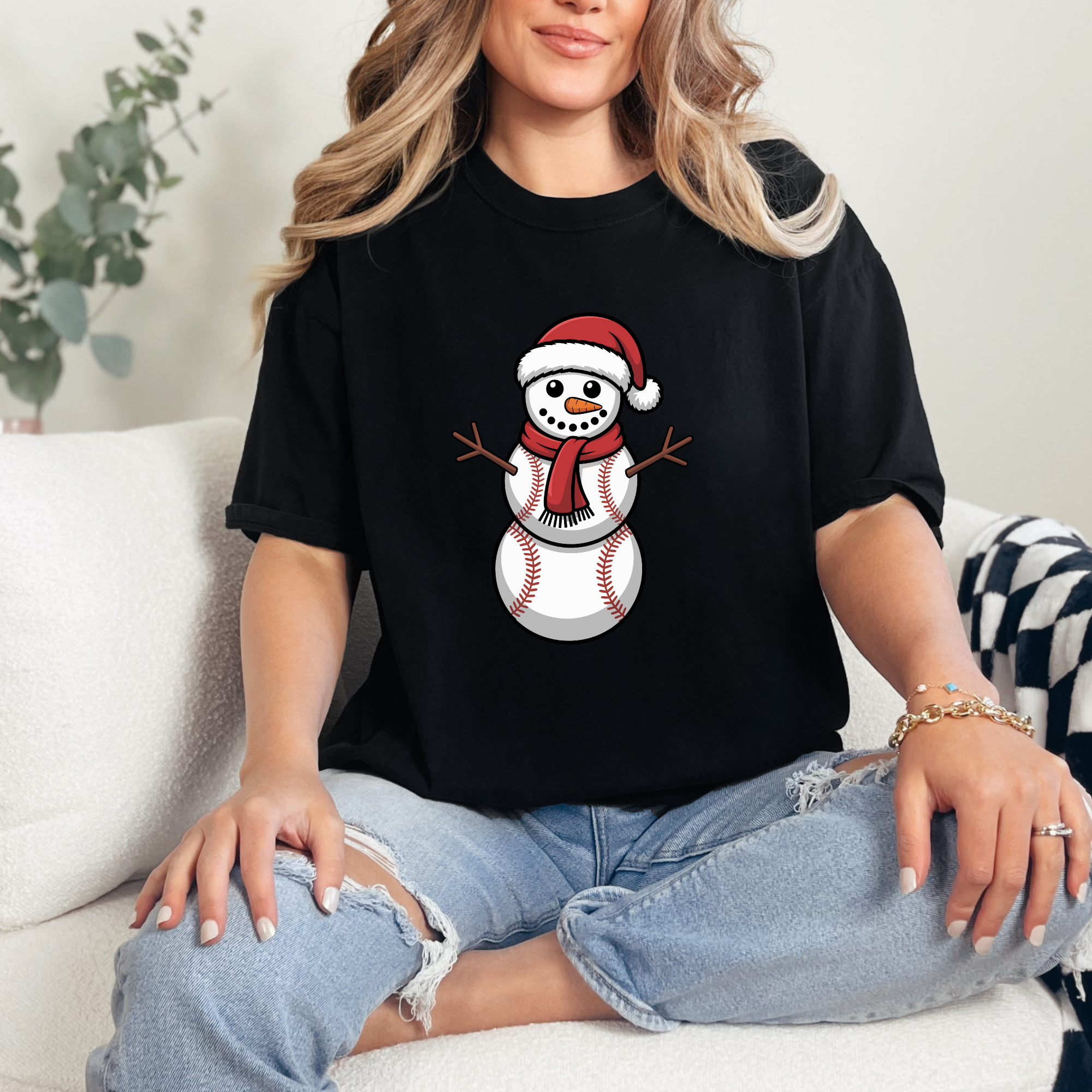 This festive tee features an adorable snowman made of baseballs — a must-have for sports fans who love a little holiday spirit. Great for winter games, gifting, or cozy days at home.