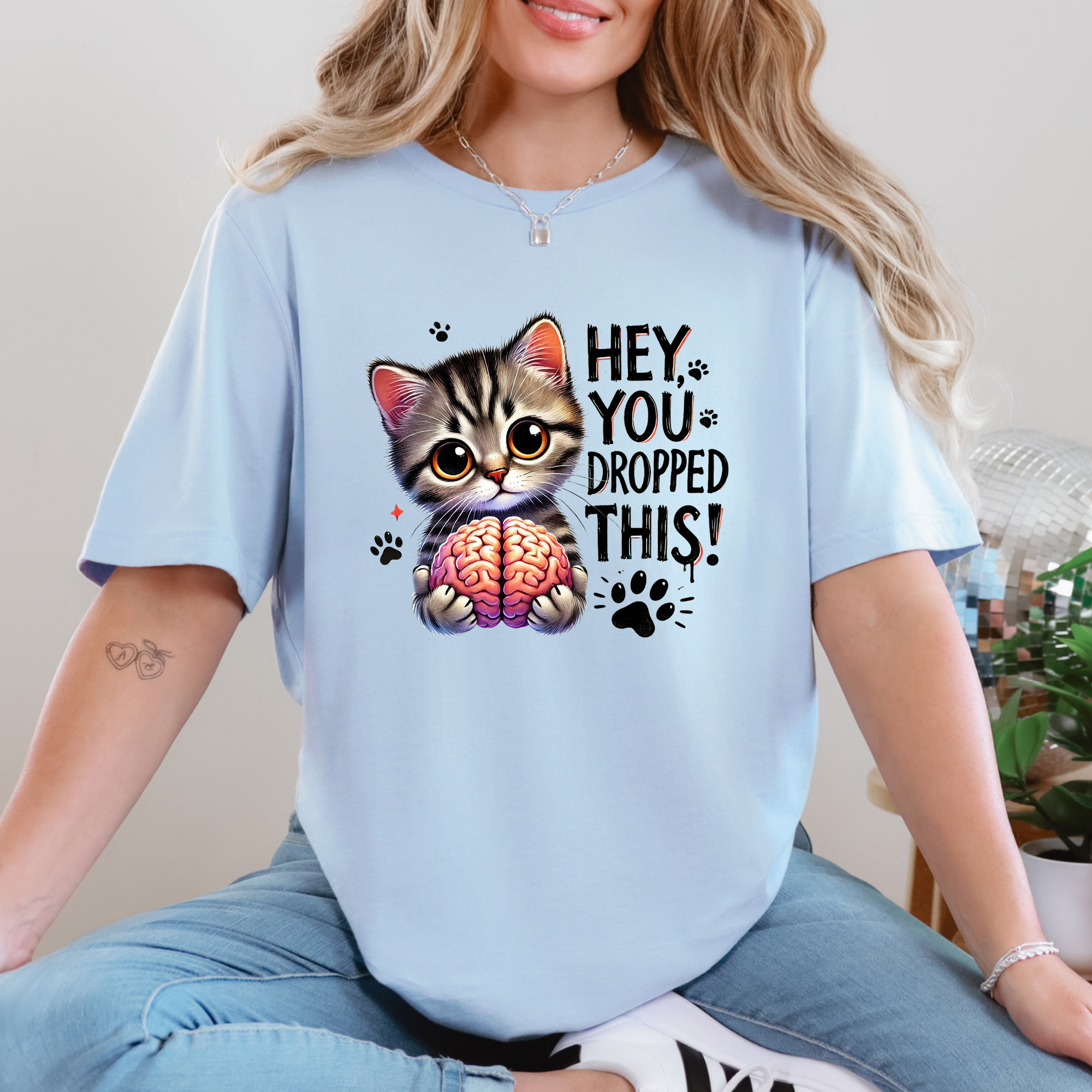 Add some playful edge to your wardrobe with this Hey, You Dropped This! Cat Tee. Featuring a wide-eyed kitten holding a cartoon brain with paw prints and bold text, this shirt is equal parts quirky, funny, and cute. Perfect for Halloween lovers, cat moms, or anyone with a sense of humor, it’s made with soft, breathable fabric for all-day comfort.