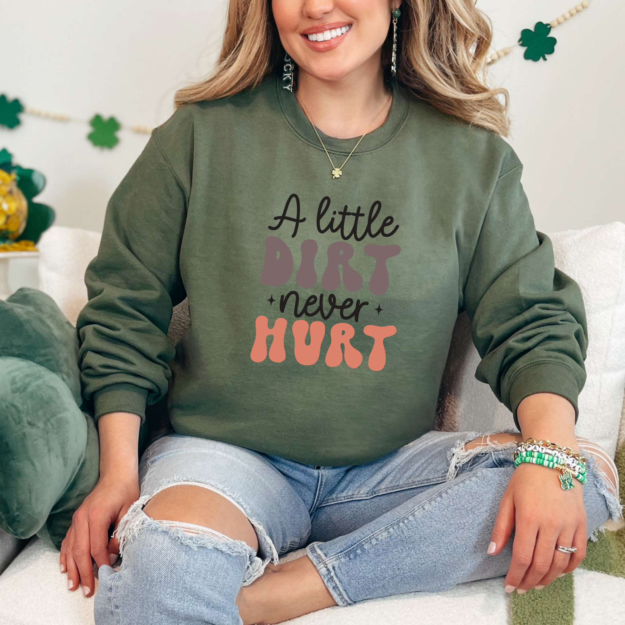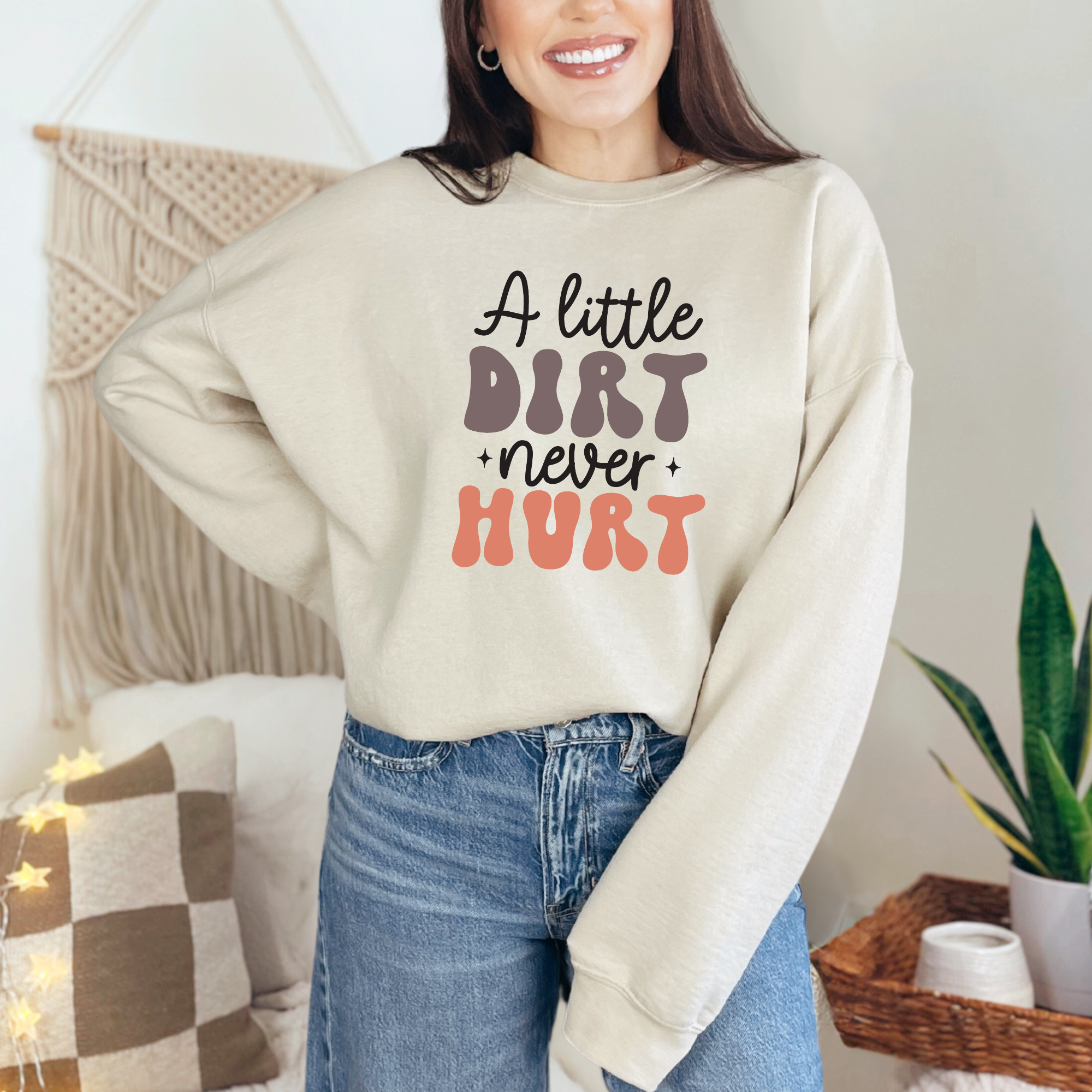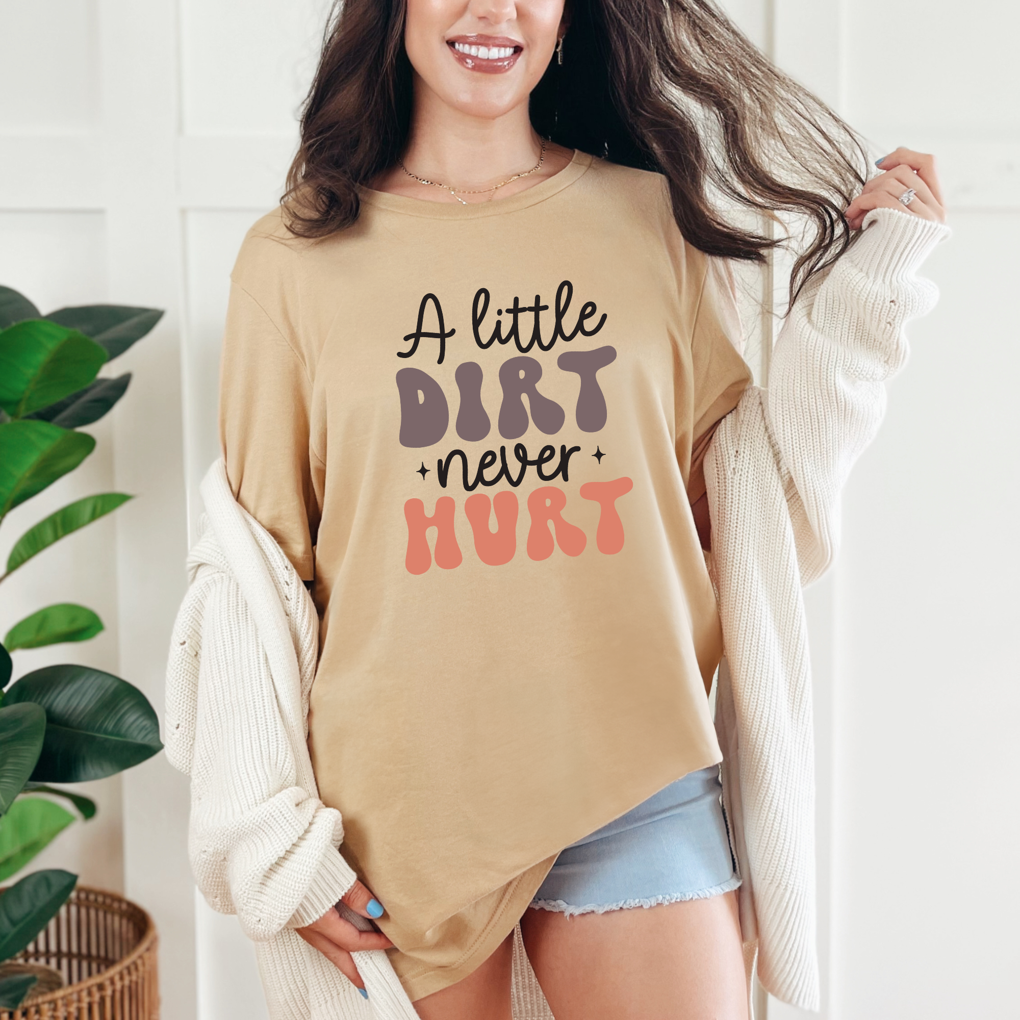 Add some playful charm to your wardrobe with our A Little Dirt Never Hurt graphic tee. Featuring bold retro lettering in earthy tones, this comfy unisex shirt is perfect for casual days, outdoor fun, or lounging in style. Made with soft cotton for all-day comfort.