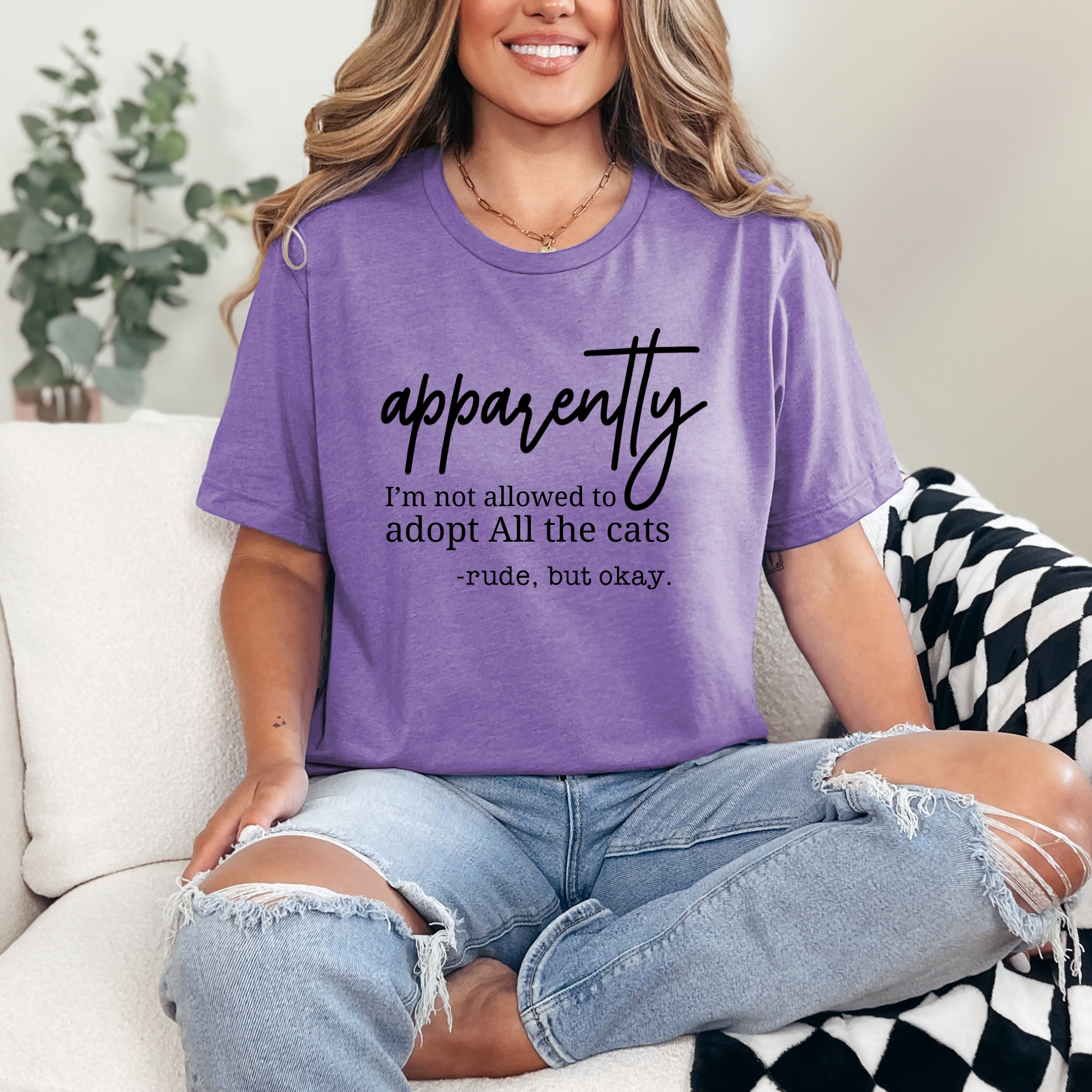 This playful “Apparently I’m Not Allowed to Adopt All the Cats – Rude, But Okay” graphic tee is perfect for anyone whose love language is rescue cats. Printed on a soft, relaxed-fit tee, it’s comfy enough for everyday wear—whether you’re running errands or browsing the adoption page… again.