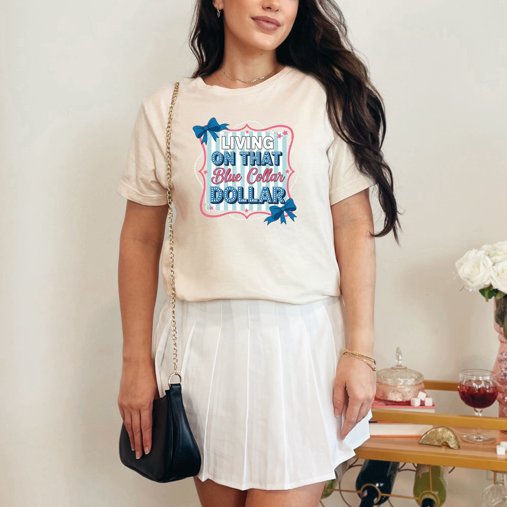 Show off your hardworking pride with our “Living on That Blue Collar Dollar” tee! Featuring bold lettering and patriotic flair, this shirt is perfect for those who hustle hard and wear their work ethic with style. Comfortable, confident, and all-American!