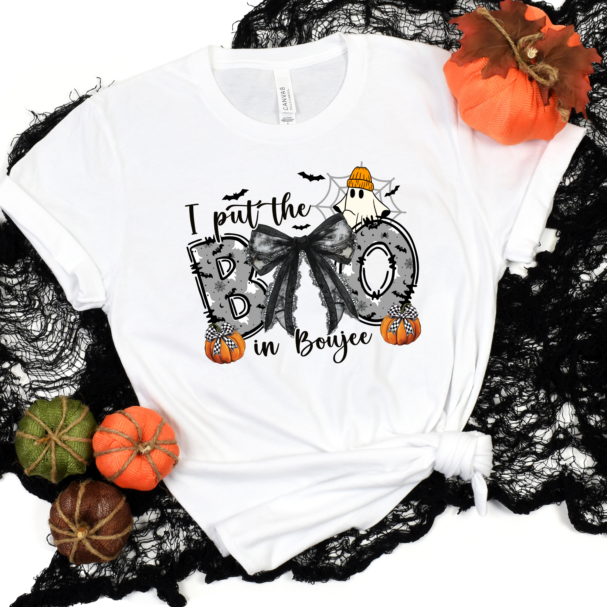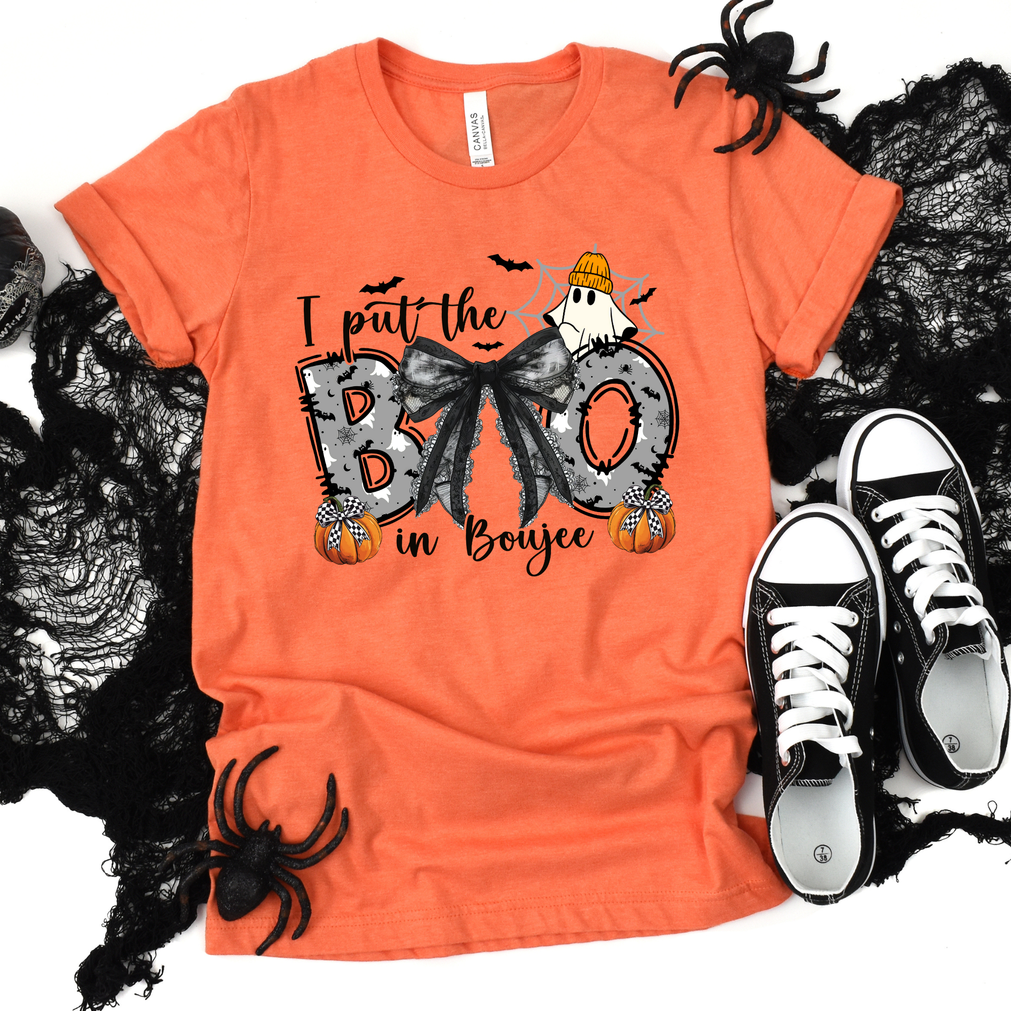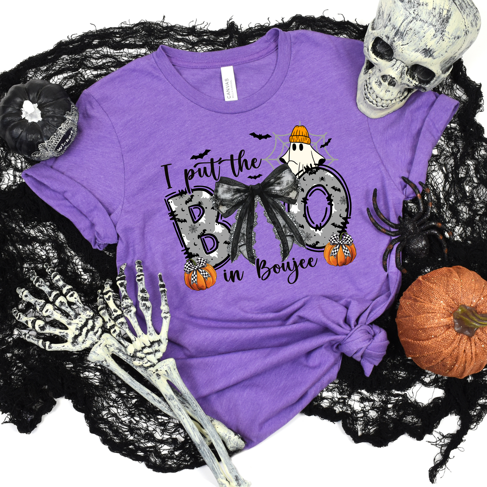 I Put the BOO in Boujee Tee – The perfect mix of spooky and stylish! Featuring a cute ghost in a beanie, chic pumpkins, and a bold bow on a soft purple tee. Fun, festive, and comfy—ideal for Halloween parties, pumpkin patches, or sipping fall lattes in style.