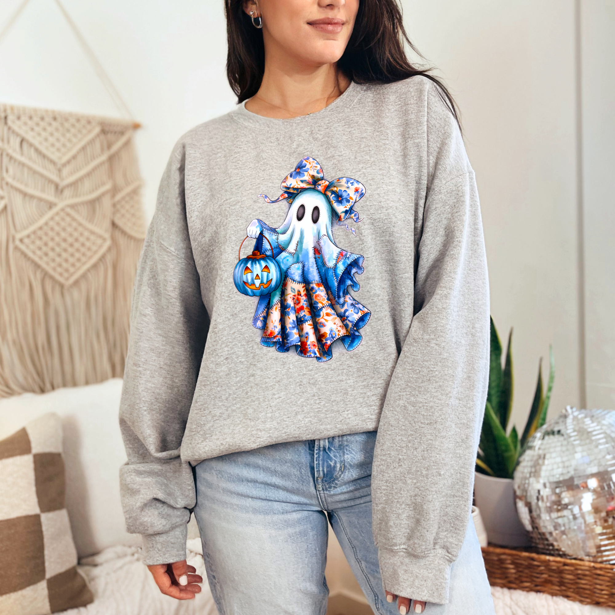 Bring spooky charm and style to your wardrobe with this adorable ghost sweatshirt! Featuring a ghost dressed in a floral blue dress with a matching bow and pumpkin bucket, this cozy sweatshirt is perfect for Halloween lovers who like their spooky season cute and stylish. Made with soft, comfy fabric, it’s ideal for cool nights, pumpkin carving, or festive gatherings.