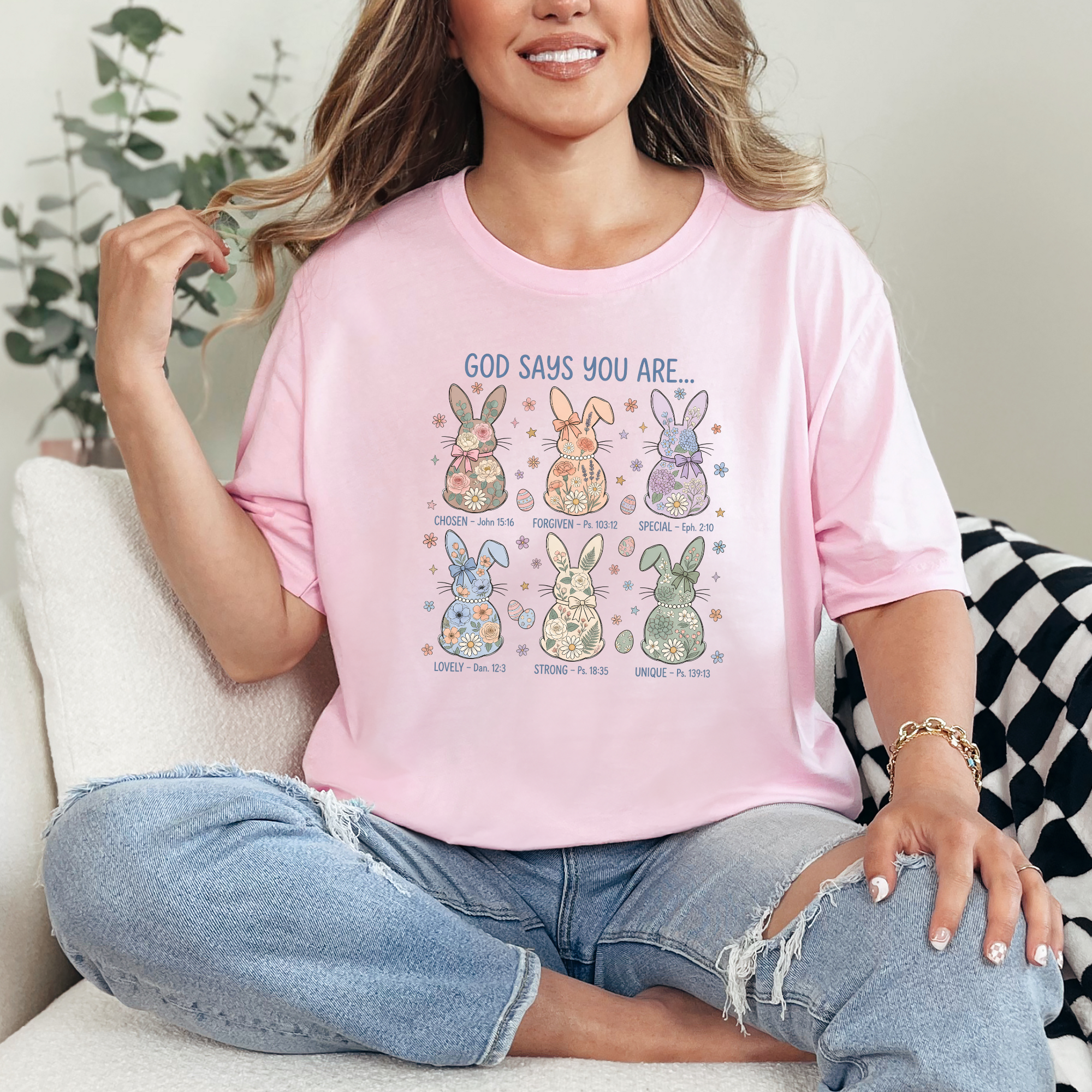Celebrate faith, encouragement, and springtime charm with this “God Says You Are…” Bunny Graphic Tee 🐰🌸 Featuring soft pastel bunnies paired with uplifting scriptures, this design is a beautiful reminder of who you are in Christ—chosen, forgiven, special, lovely, strong, and unique.
