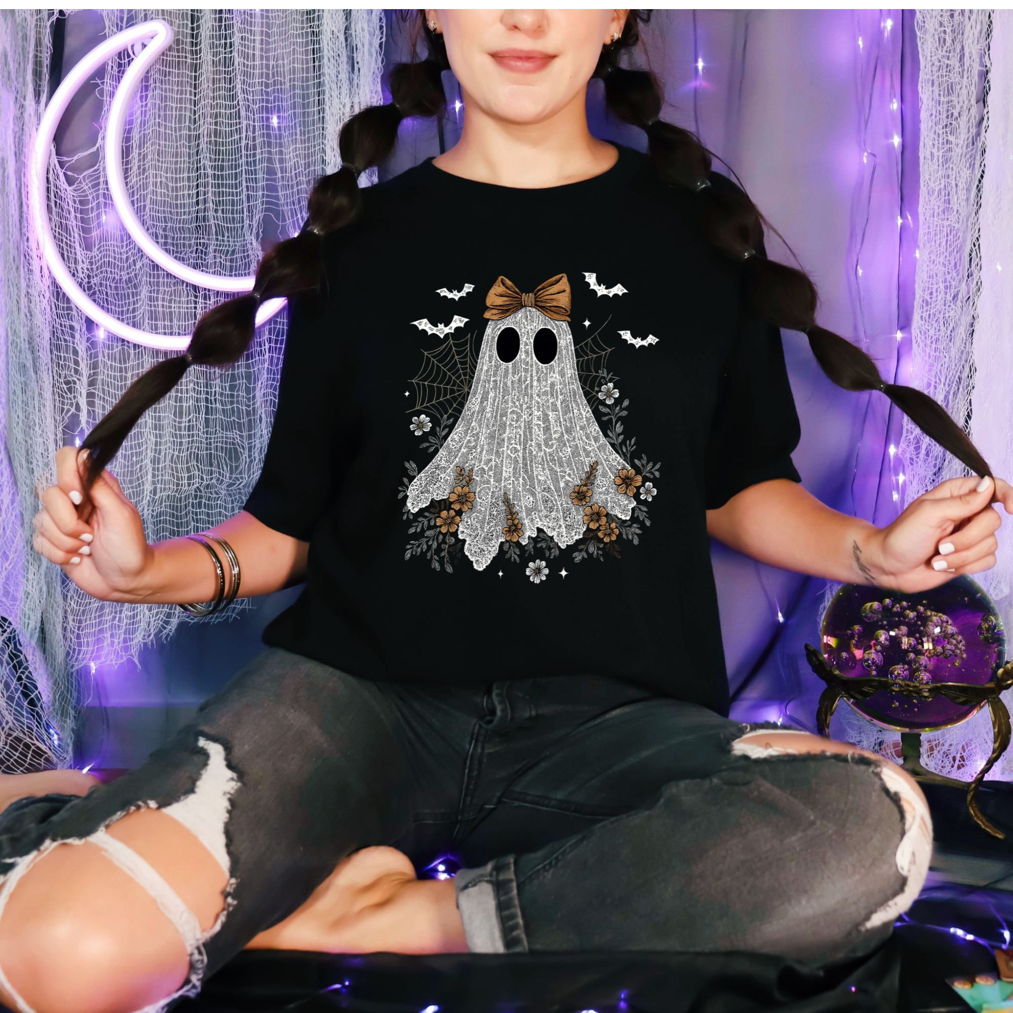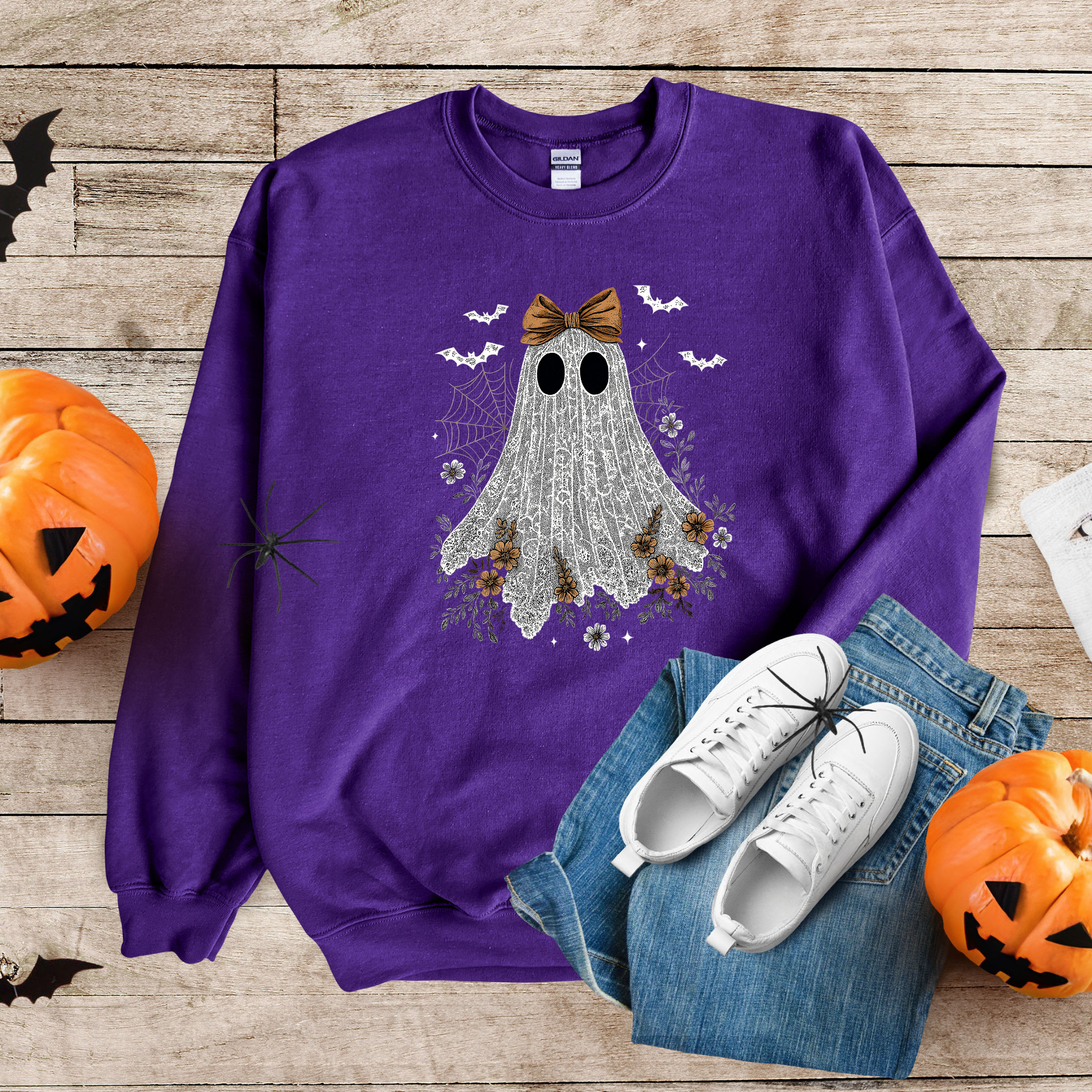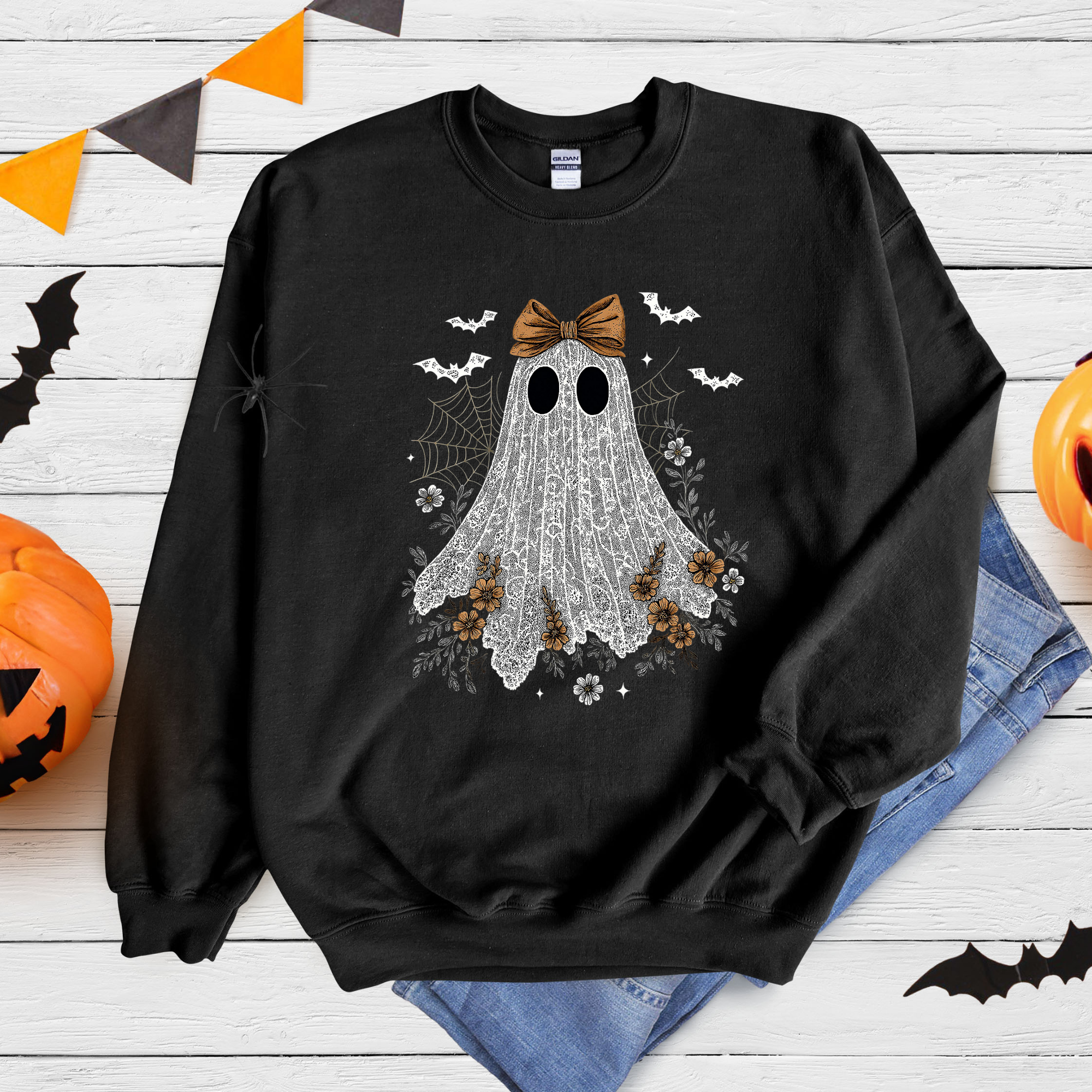 Spooky chic meets cozy vibes! This lace ghost sweatshirt features floral details, a cute bow, and a touch of Halloween charm. Perfect for festive nights, pumpkin carving, or staying warm while looking boo-tiful.