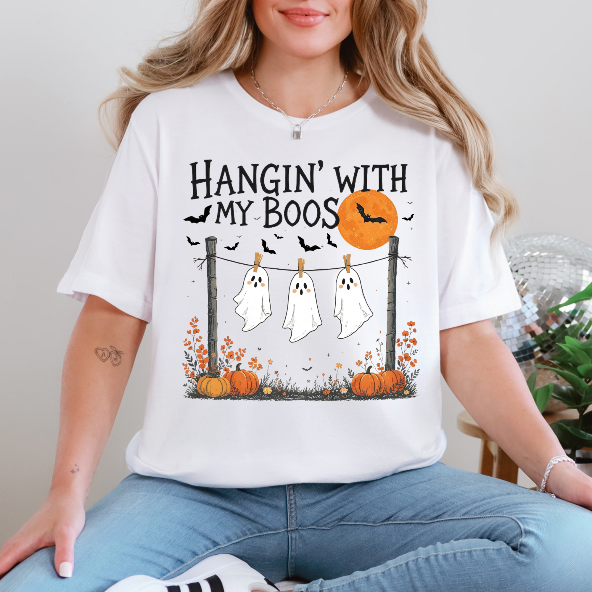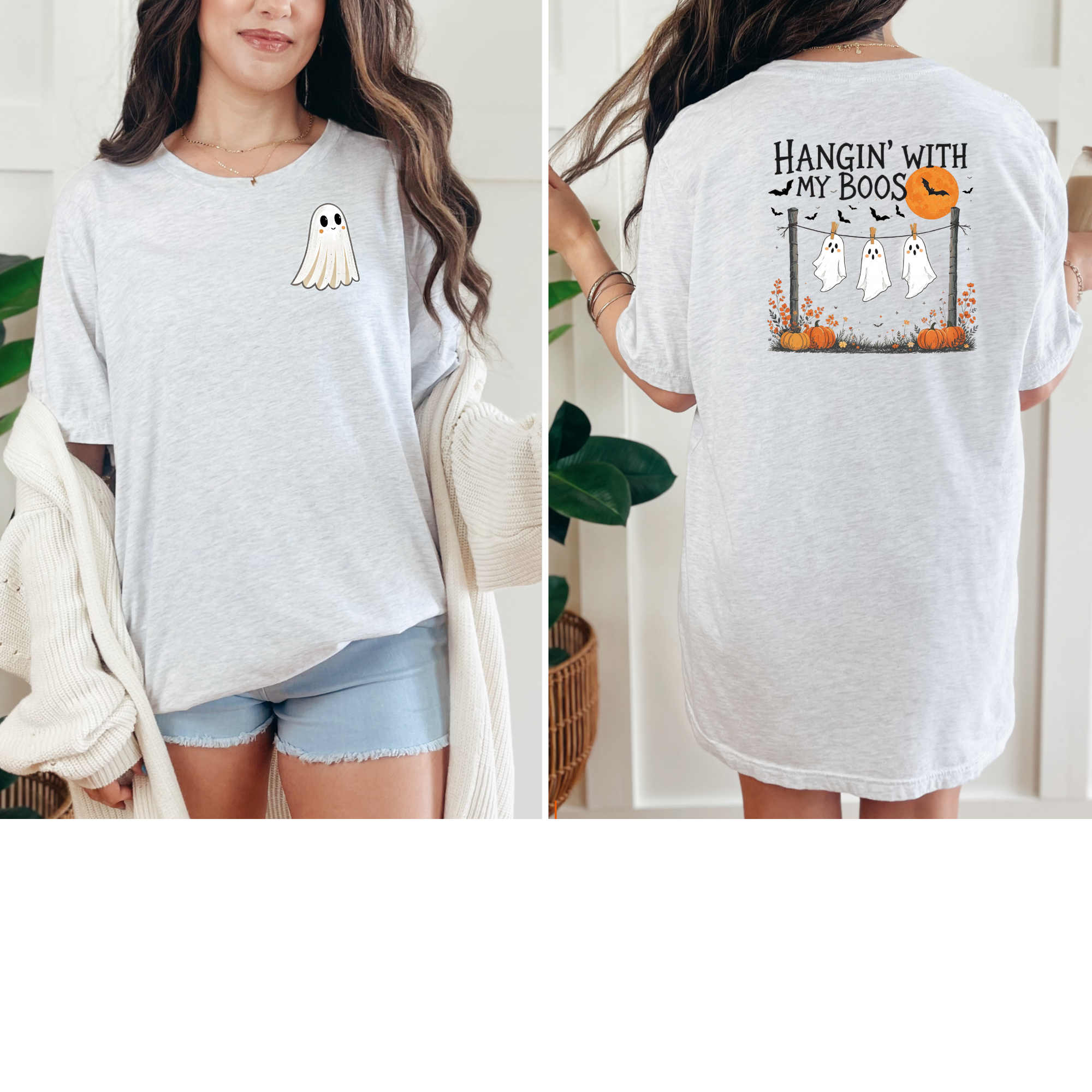 Keep it spooky and sweet with our “Hangin’ With My Boos” tee! Featuring a cute ghost pocket graphic on the front and a festive fall scene on the back, this shirt is perfect for Halloween hangouts and ghostly good times with your crew.