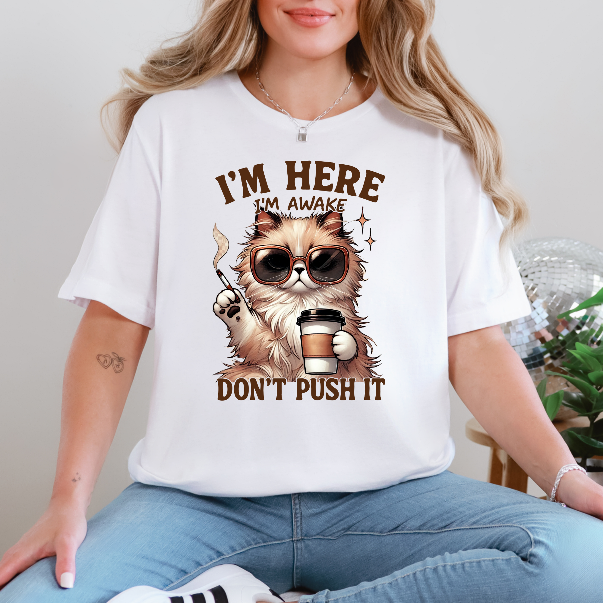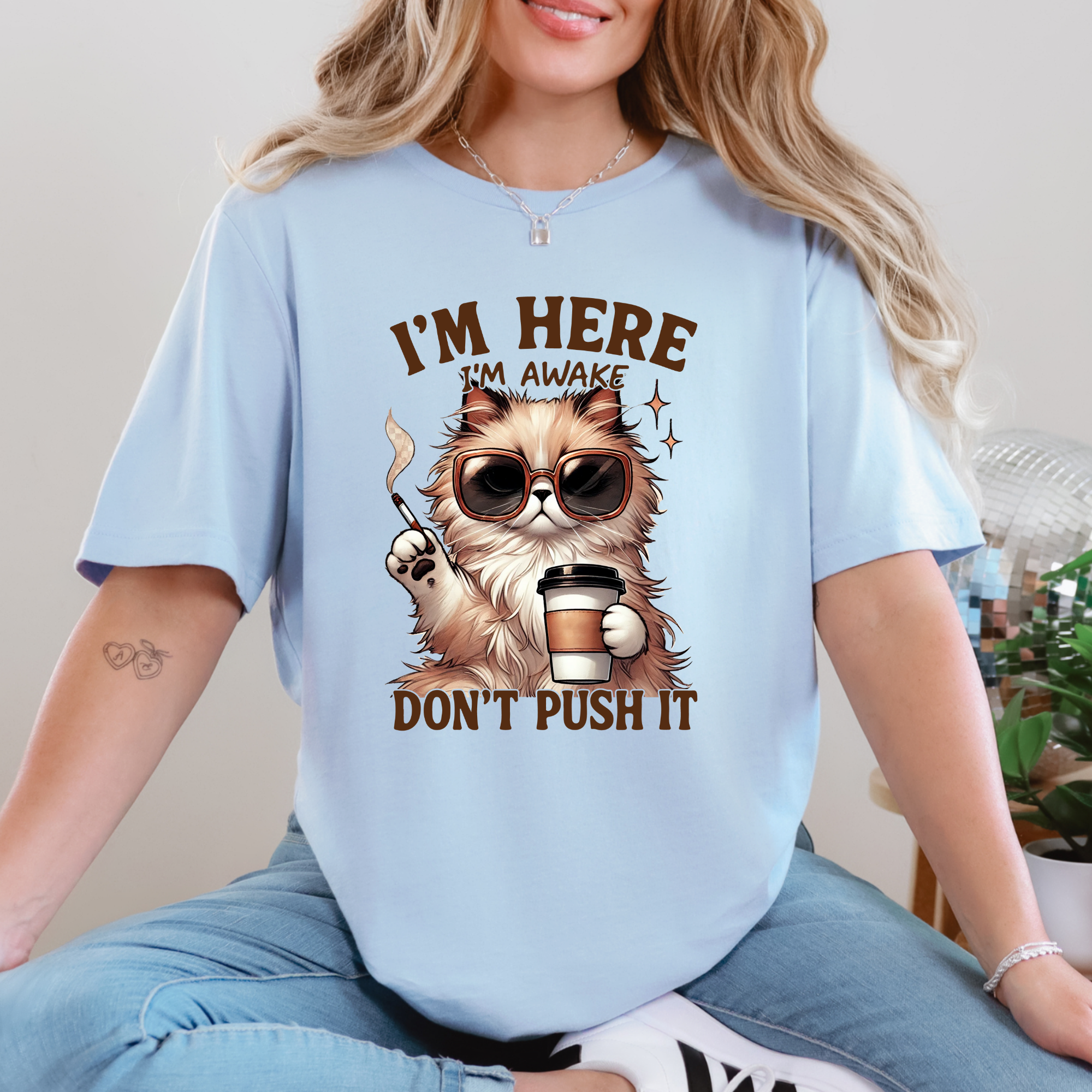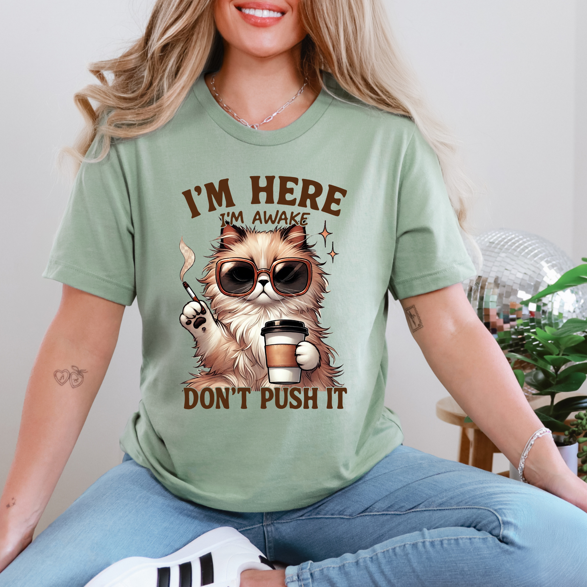 Start your day with sass in our 'I’m Here, I’m Awake, Don’t Push It' tee! Featuring a stylish, coffee-loving cat with serious morning vibes, this soft and comfy shirt is perfect for caffeine queens and anyone who needs space before their first cup.