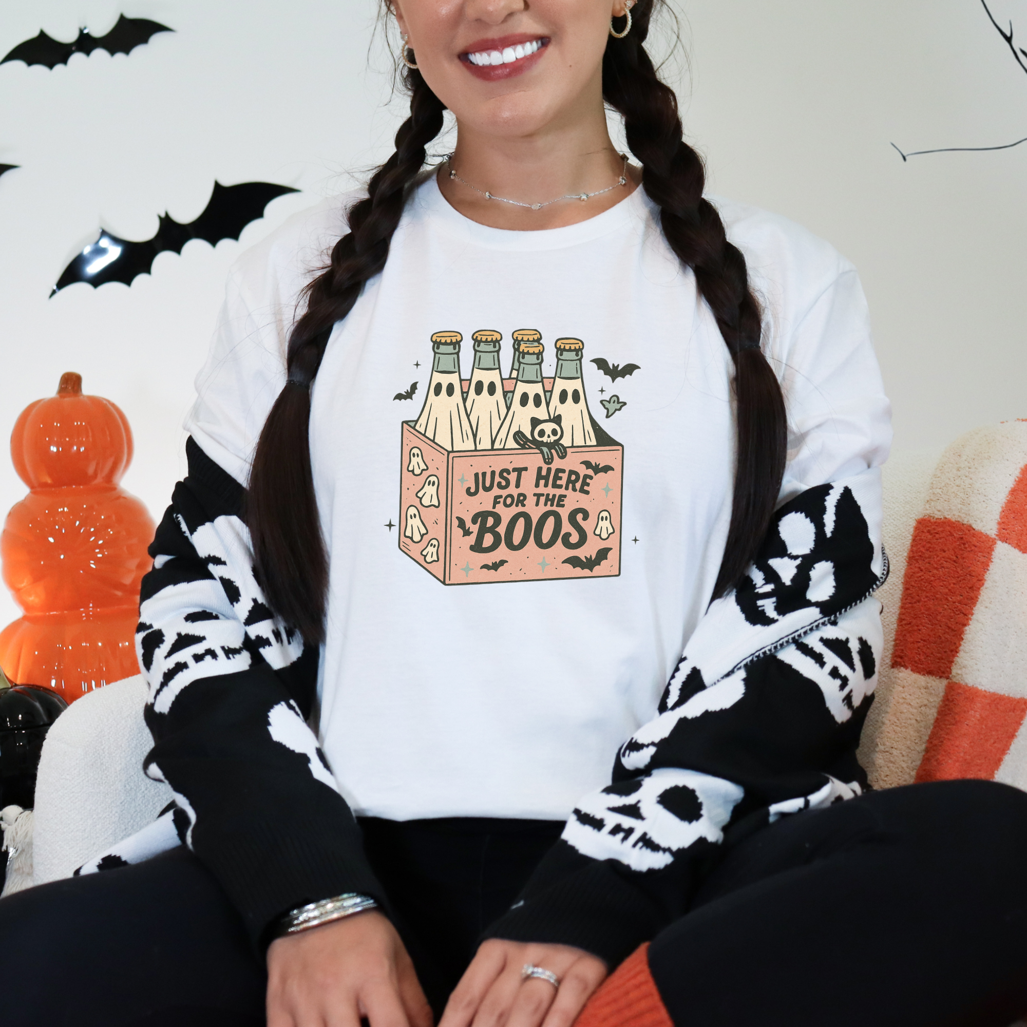 Get spooky (and a little silly) with our "Just Here for the Boos" tee! Featuring ghostly beer bottles in a retro-style crate, this soft, unisex shirt is perfect for Halloween parties, pumpkin patches, or handing out candy in style.
