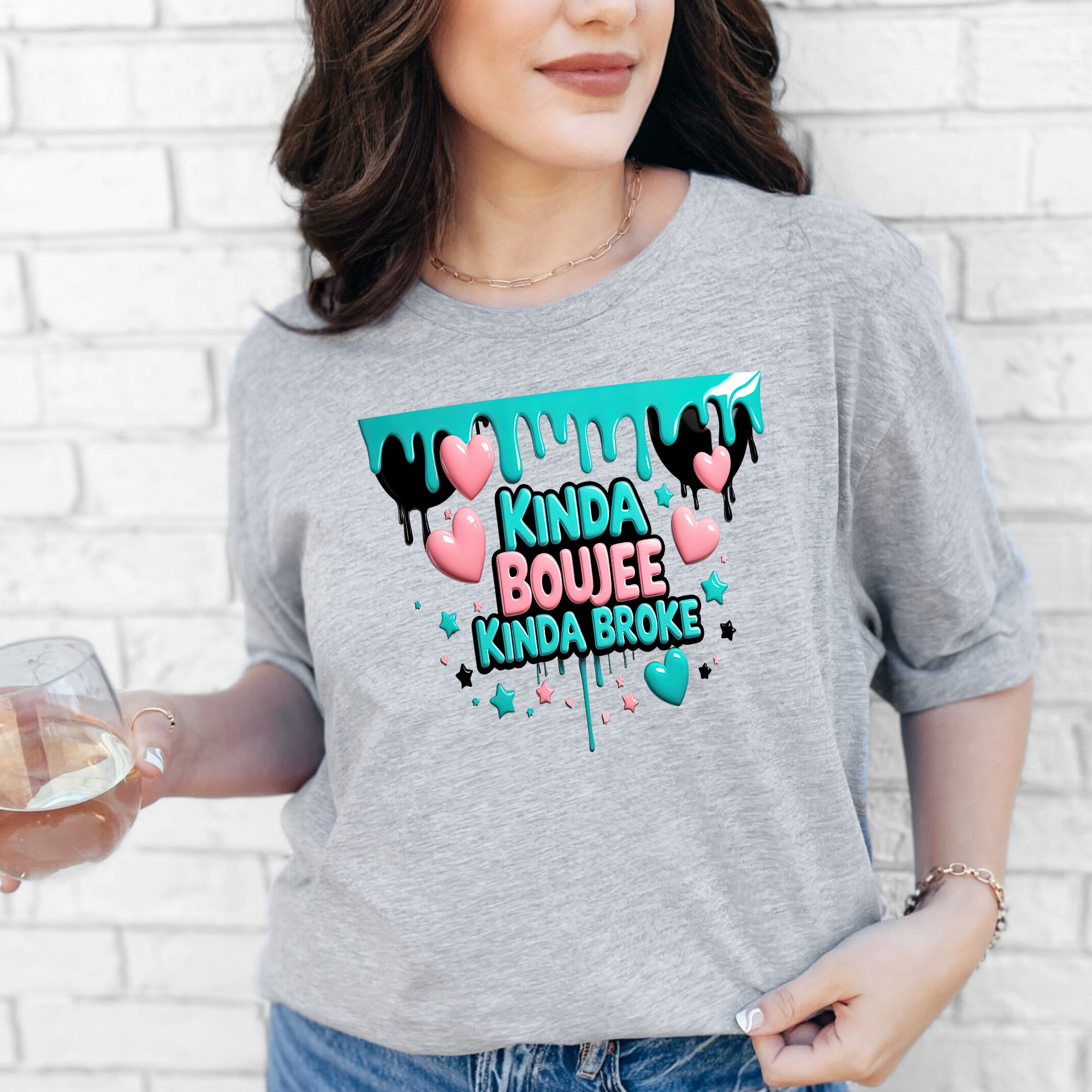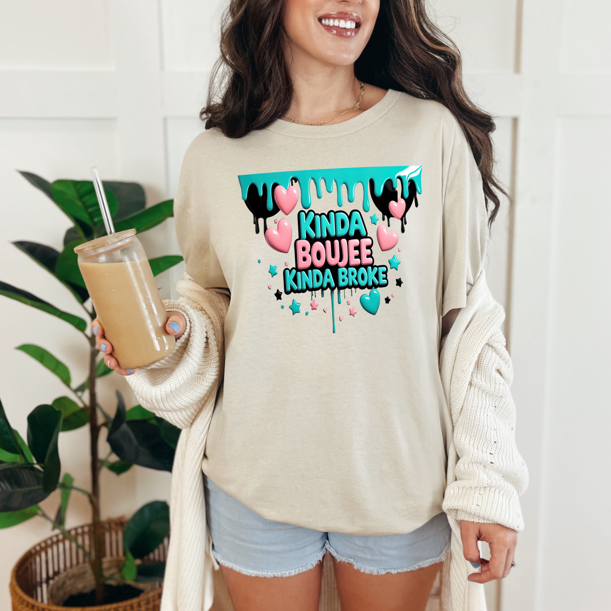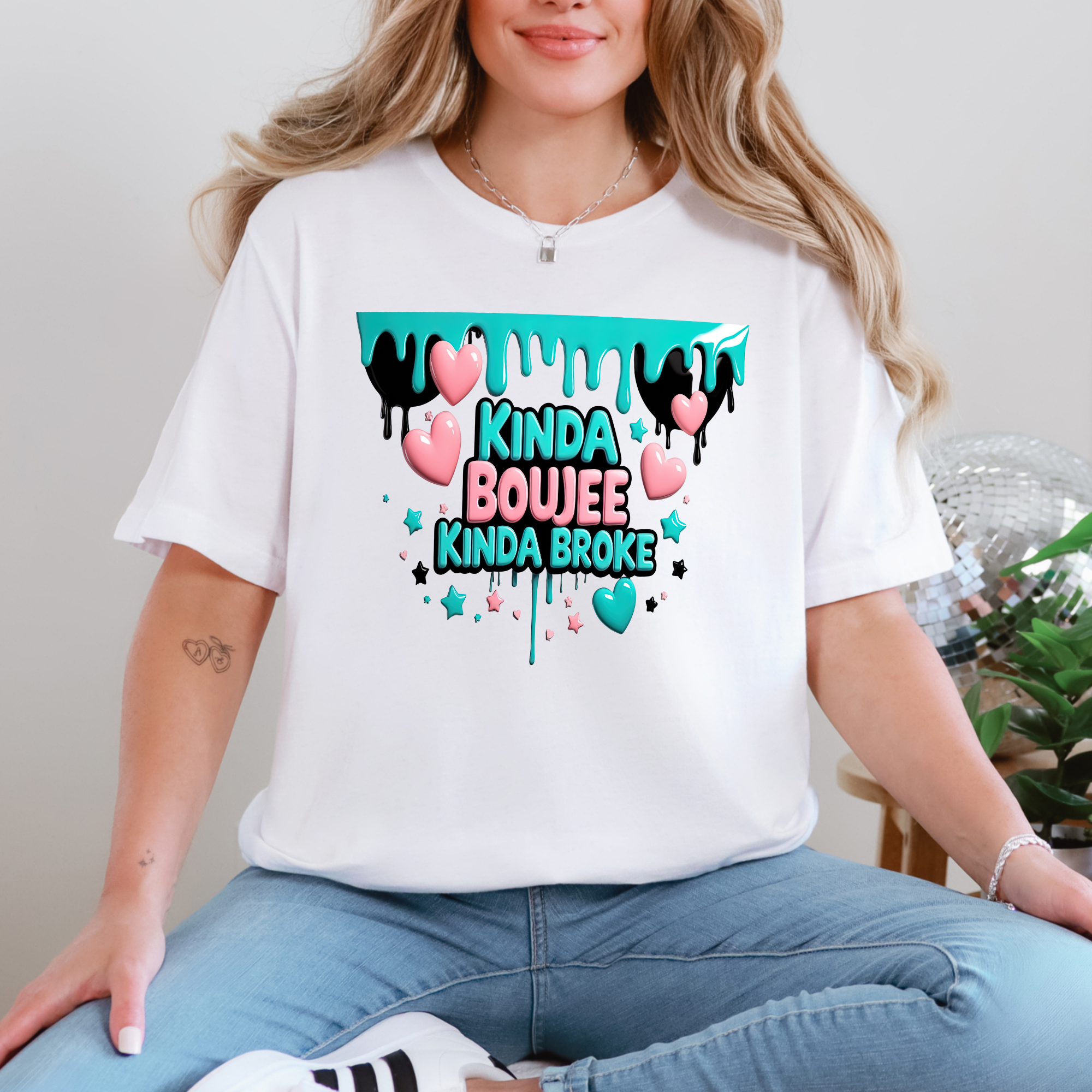 Show off your glam-meets-real-life vibe with our 'Kinda Boujee Kinda Broke' tee! Featuring playful pastel hearts and a bold drip design, this soft, comfy shirt is perfect for casual days with a side of sass.