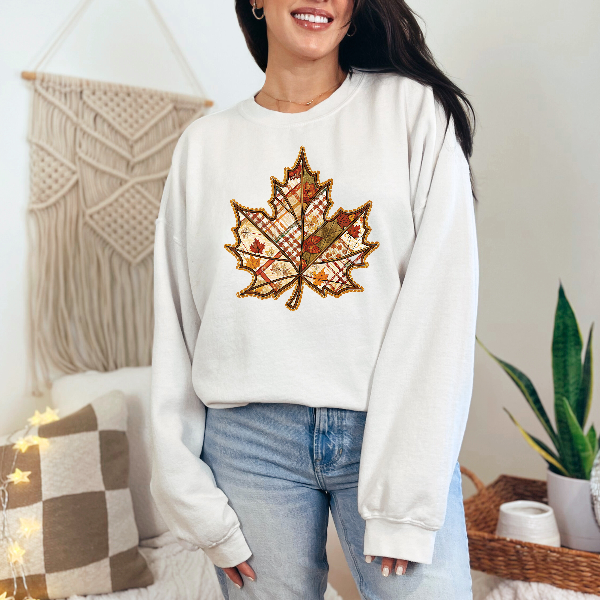 Celebrate cozy fall vibes with this charming patchwork leaf sweatshirt. Featuring a large autumn leaf design filled with plaid, stars, and seasonal patterns, it’s the perfect mix of rustic and festive. Made from soft, comfy fabric, this sweatshirt is great for layering on crisp autumn days, pumpkin patch visits, or staying warm by the fire.