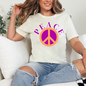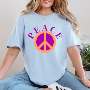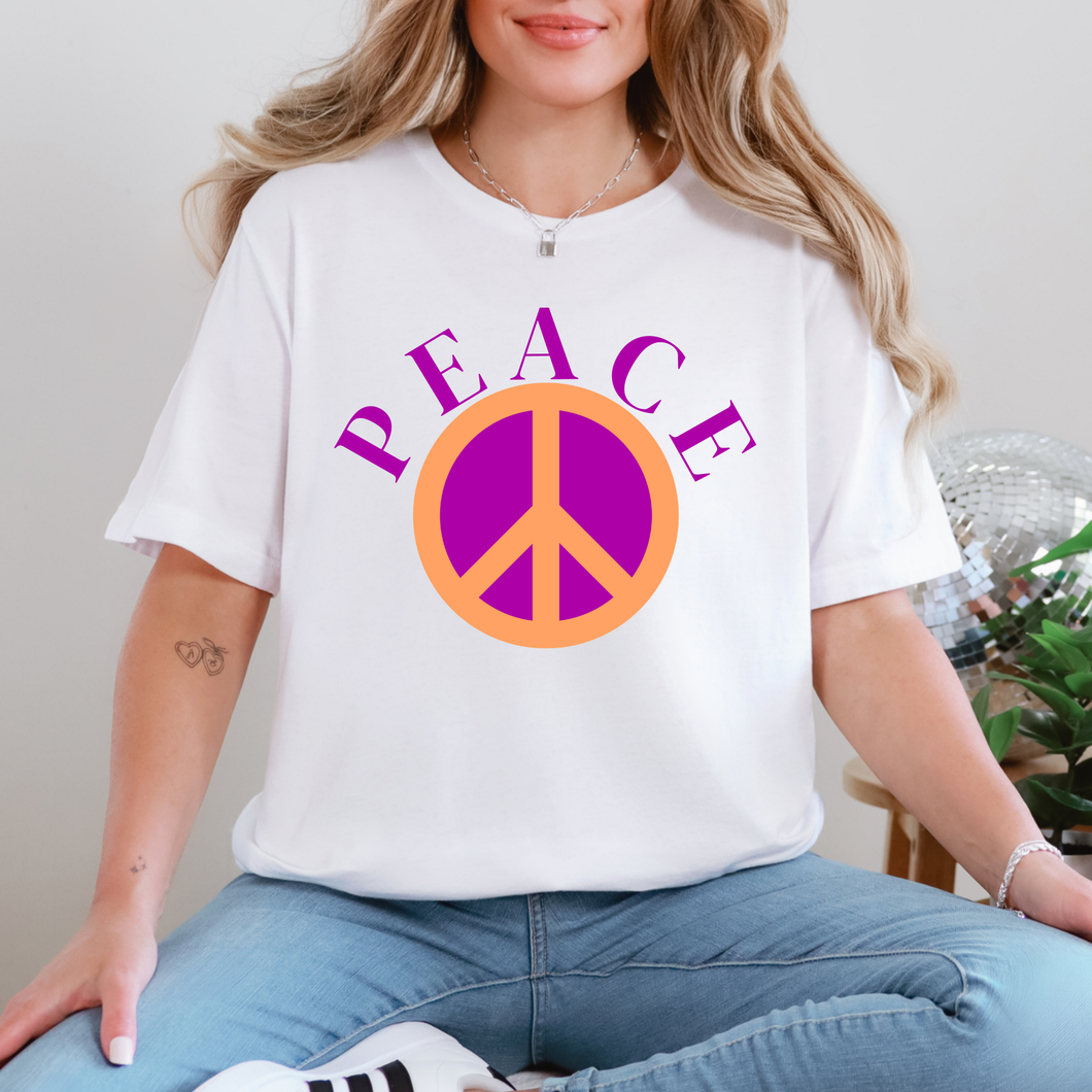 Spread good vibes everywhere you go with this retro-inspired Peace Sign Tee. Featuring bold purple and orange lettering with a classic peace symbol, this comfy graphic shirt is perfect for free spirits, music lovers, and anyone who believes in kindness. Made with soft, breathable fabric for all-day comfort. ✌️✨
