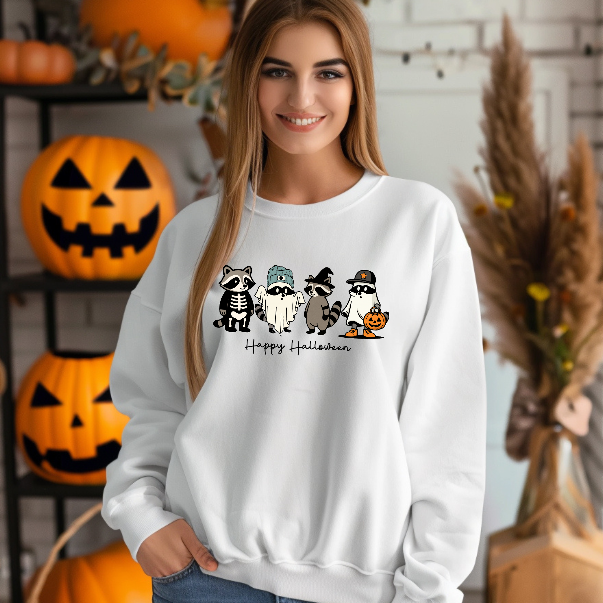 Bring some woodland charm to spooky season with this adorable Happy Halloween tee! Featuring four dressed-up raccoons in fun Halloween costumes, this soft and comfy shirt is perfect for trick-or-treating, pumpkin carving, or cozy fall nights. A cute and quirky way to celebrate October!