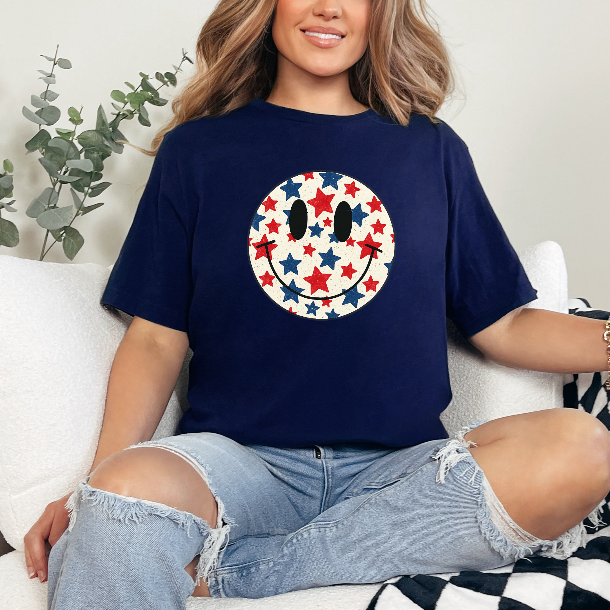 Add a pop of patriotic charm to your everyday look with this Stars & Smiles Graphic Tee ⭐😊 Featuring a vintage-inspired smiley filled with red, white, and blue stars, this tee is perfect for summer days, holidays, and laid-back Americana vibes.