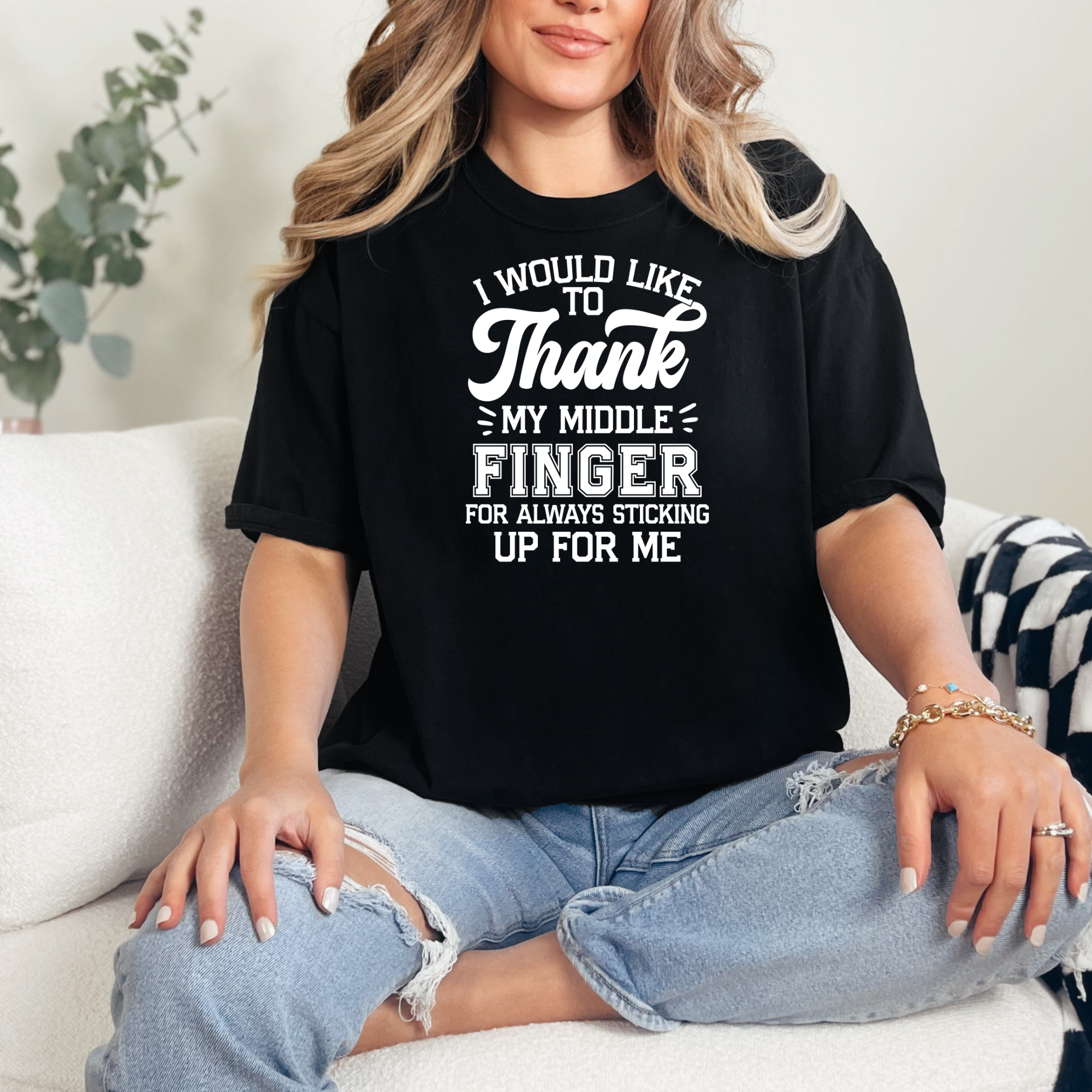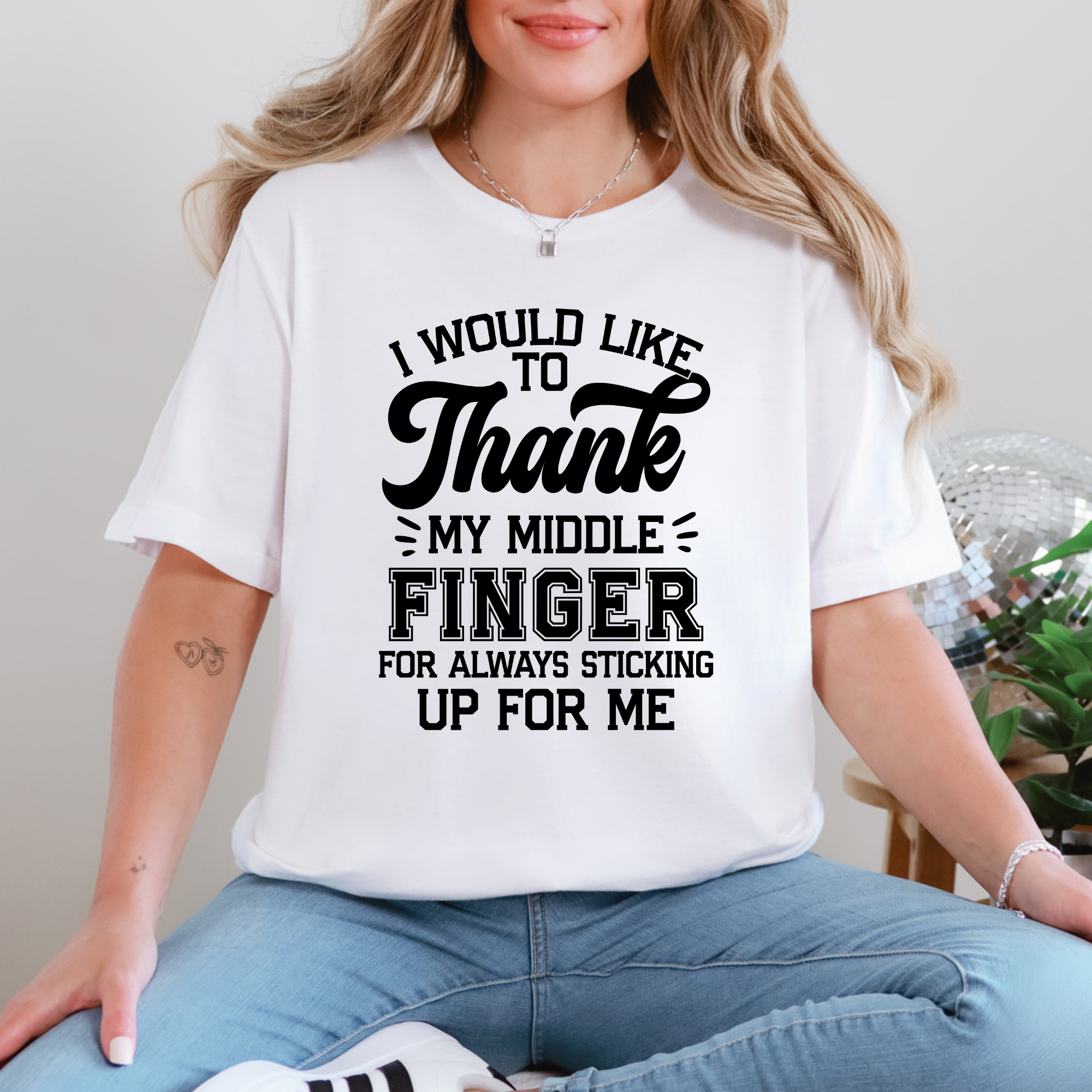 Let your sass speak loud and proud! This bold and cheeky tee says, “I would like to thank my middle finger for always sticking up for me.” Perfect for those with attitude and a sense of humor. Soft, comfy, and unapologetically honest!