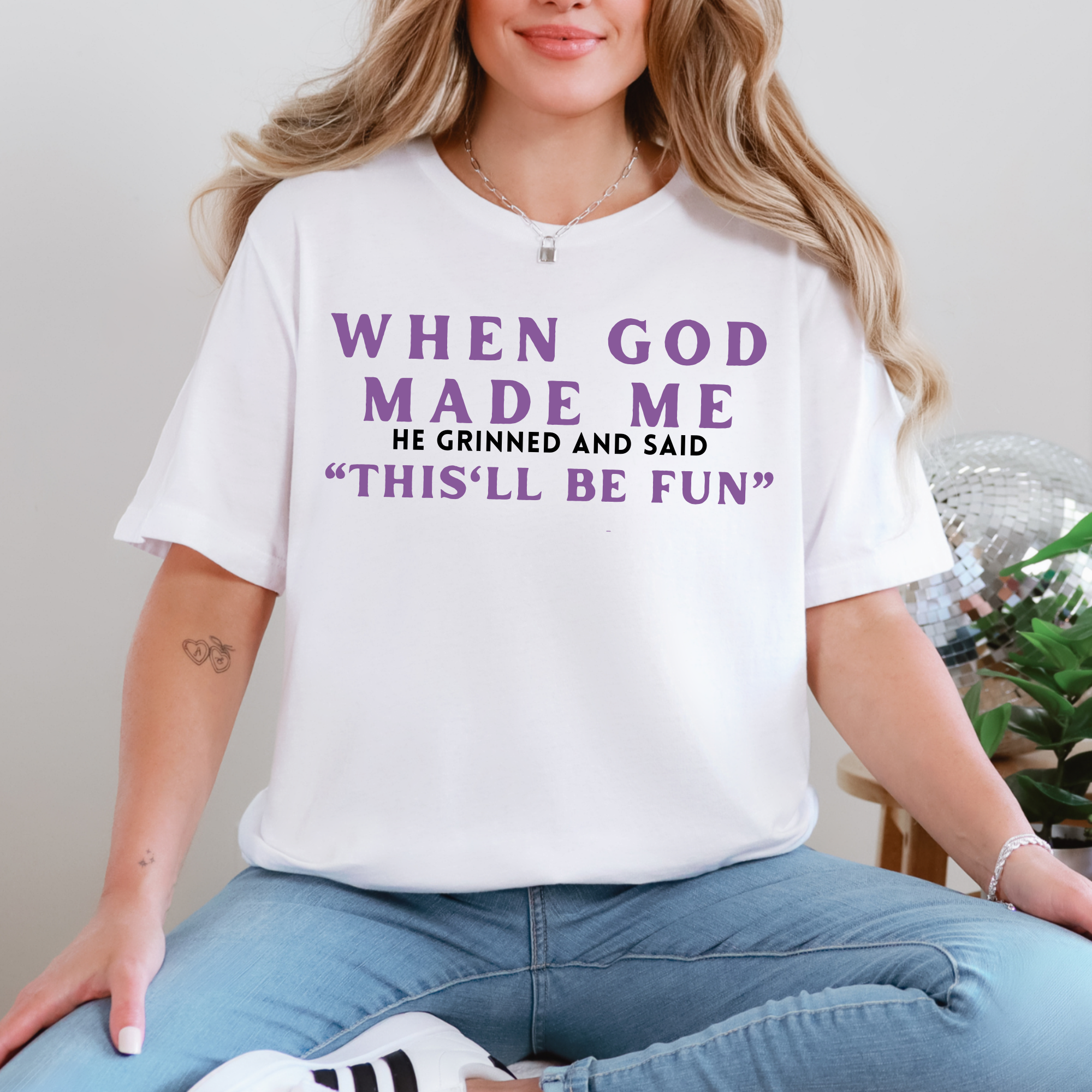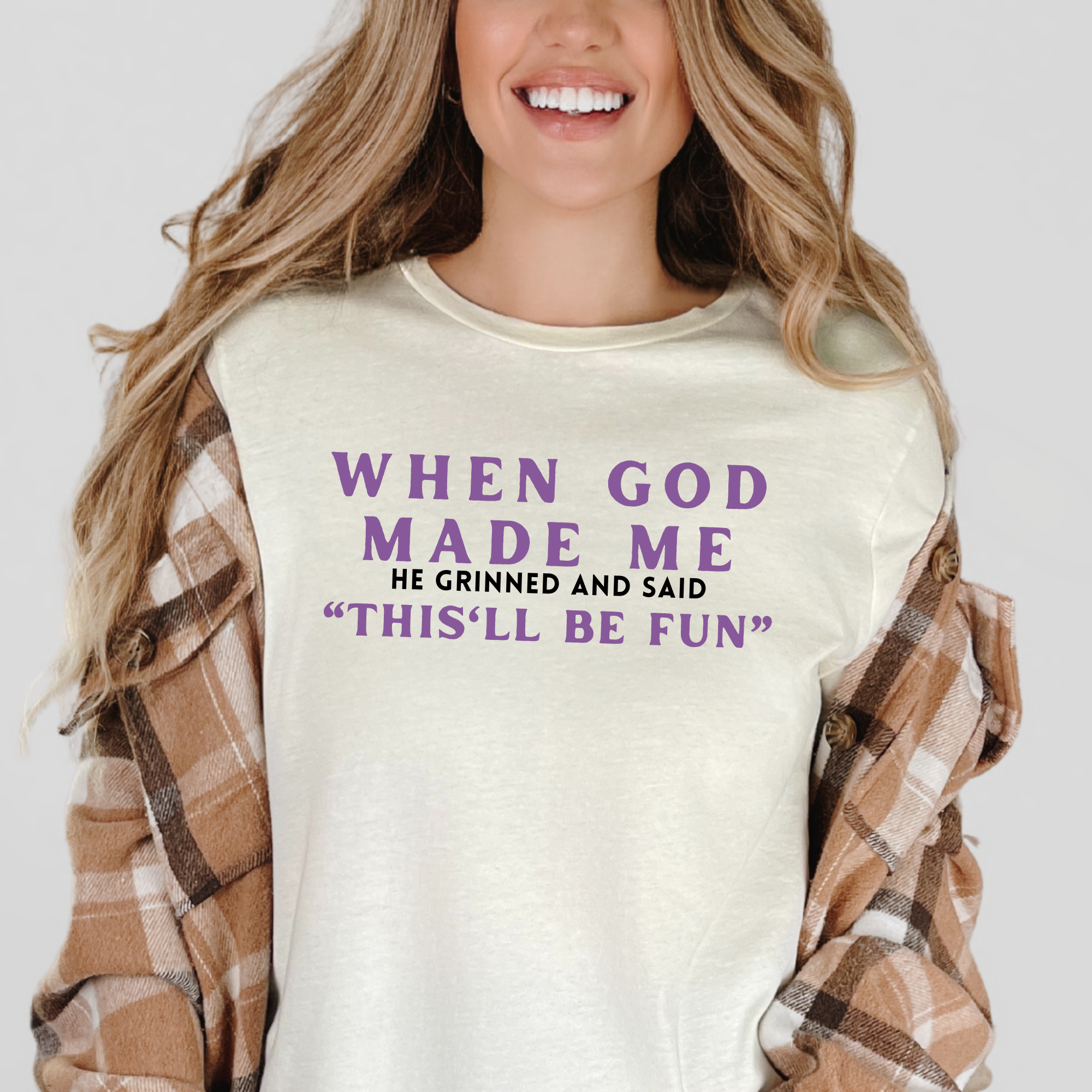Show off your bold personality with our 'When God Made Me, He Grinned and Said This’ll Be Fun' tee! Soft, comfy, and full of charm, this shirt is perfect for anyone who loves faith-based humor with a playful twist.