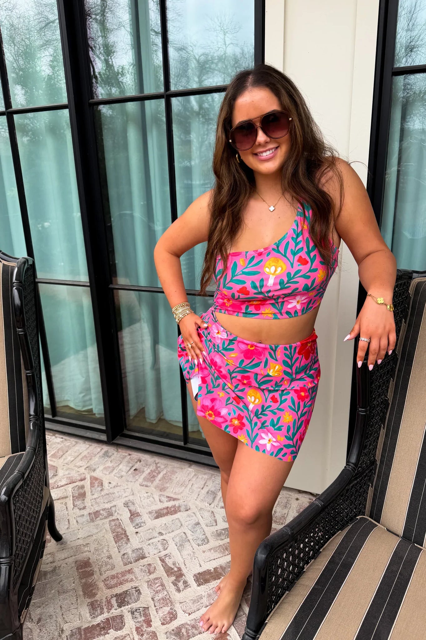 Turn heads in this vibrant tropical print ONE piece swimsuit ! Featuring a one-shoulder top connected on the side to the high-waisted skirt bottoms with bikini bottoms underneath. Fun, flattering, and totally eye-catching—this look is your new sunny-day favorite!